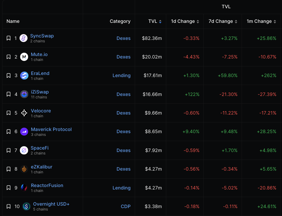 SyncSwap is a Decentralized Exchange built on the ZkSync Era and the one with a first mover advantage. The platform offers one-stop trading of crypto with lower fees given the ZkSync technology. At the time of this writing, it is the leading protocol in ZkSync in terms of TVL ($60 MM).