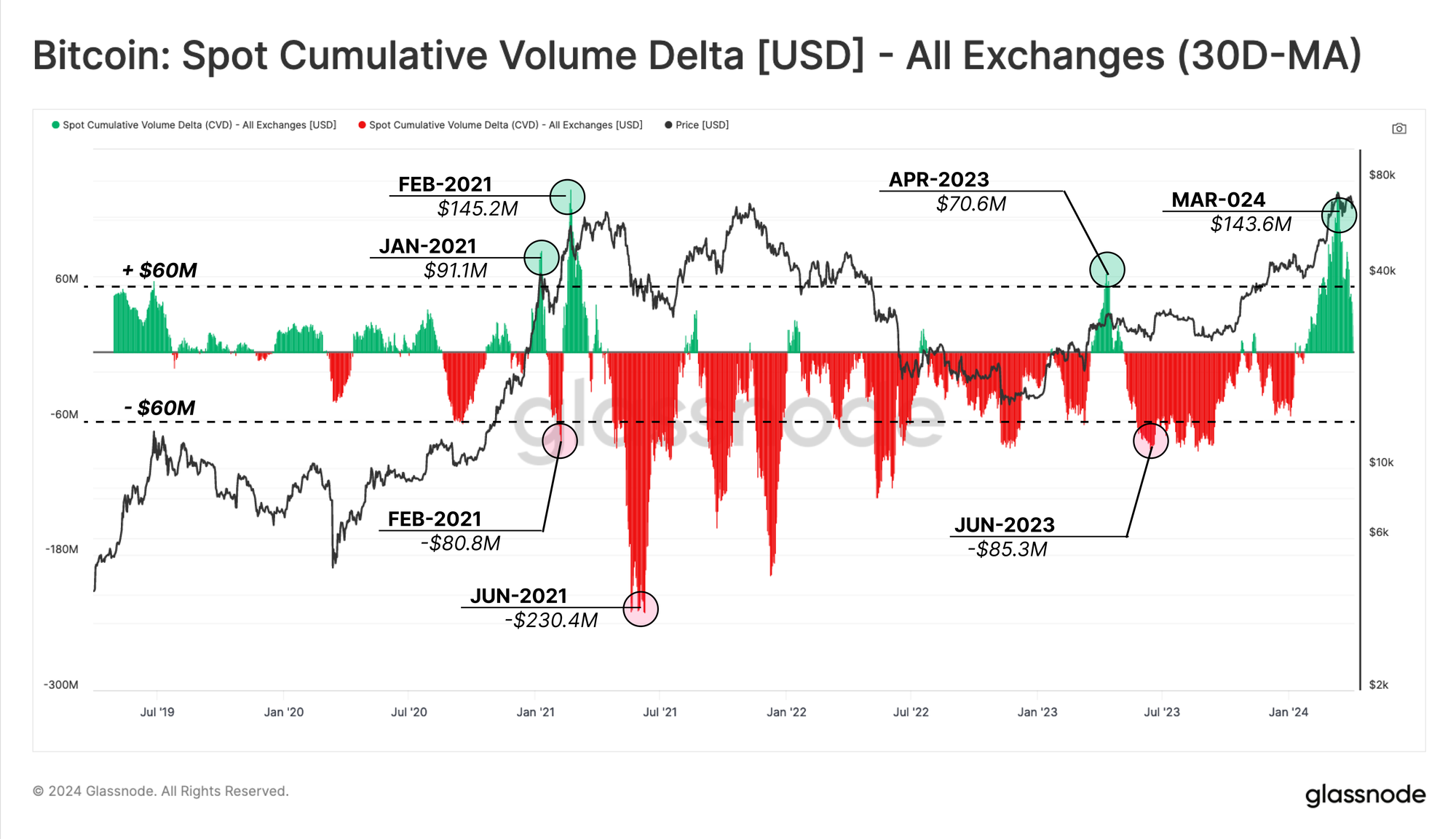 The daily spot trade volumes, although reduced from the mid-March peak to about $7 billion per day, still mirrored the intensity of the 2020-2021 bull market. The strong trading volume underscored a persistent euphoria sentiment in the market, characterized by a net buy-side bias in the Cumulative Volume Delta (CVD). This indicator, which measures the net amount of buying versus selling, highlights the ongoing speculative interest and the bullish sentiment prevailing among traders.