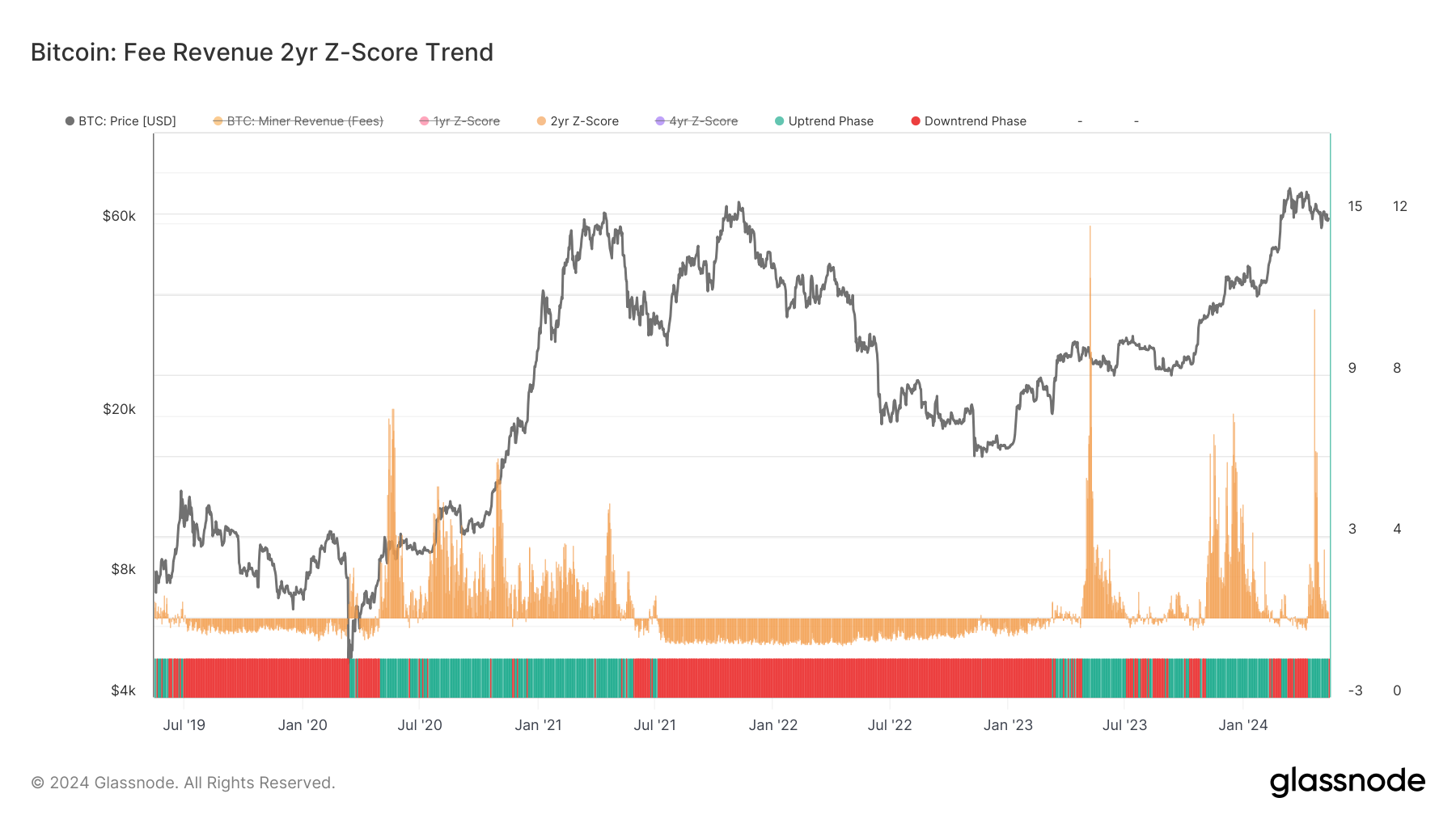 In our analysis of Market Momentum trends, we have highlighted the Miner Revenue Momentum. This metric uses the proportion of miner revenue earned from fees to gauge blockspace demand. Fee pressure increases when users express heightened urgency and are willing to pay higher fees for inclusion in the next block. By applying a 2-Year rolling Z-Score to this data, we can standardize the dataset across cycles and spot inflexion points, such as upticks in fees during a waning bear market or declines after a cycle peak.