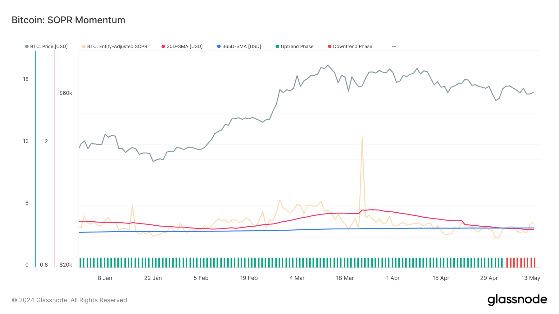 - SOPR Momentum: The Spent Output Profit Ratio (SOPR) Momentum is also trending downward, with the monthly average recently dropping below the yearly average. This trend is not yet strong but indicates that the profitability of transacted coins is decreasing, which could lead to more cautious spending behaviour among traders.