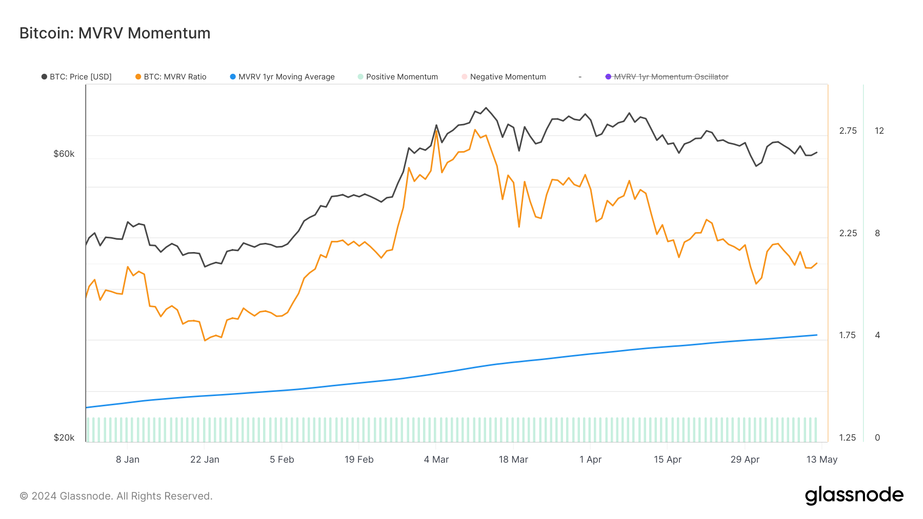- MVRV Momentum: The overall Market Value to Realized Value (MVRV) Momentum remains above the yearly average, indicating that, on average, holdings are still valued higher than their cost basis. However, the Short-Term Holder MVRV has reversed and is now trending downward, suggesting that recent market entrants are starting to see less profit, which may increase selling pressure.