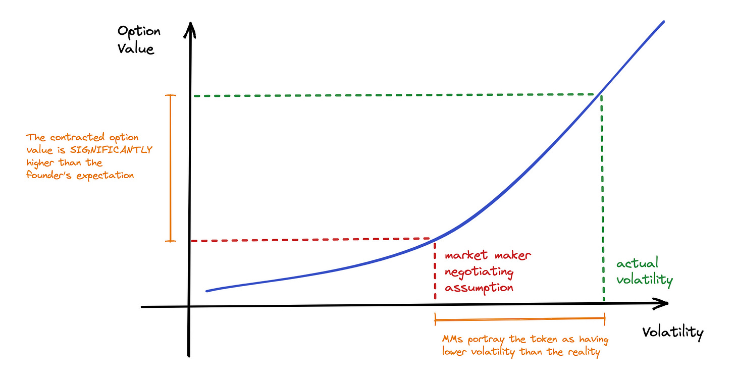 MMs leverage options to persuade founders to sign with them, indicating that using options aligns them with the token’s success (i.e. increasing token price). This was particularly common in bull markets, where there was a non-zero probability of an early-stage project token increasing 100x, and MMs pushed harder for option deals (and often succeeded).
