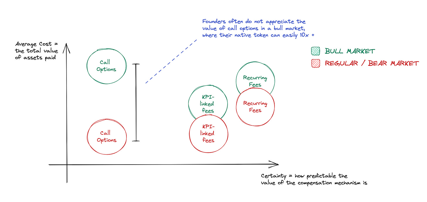 Visualisation of compensation mechanisms: Measured by the metrics of “certainty” or “average cost”, fees are generally carry more certainty (in $ value) than options, but may be significantly more expensive depending on the state of the market. However, in bull markets, call options can easily inflate to extreme values if the underlying token skyrockets.