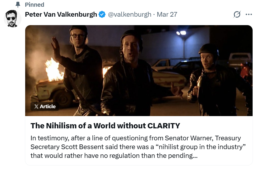 In an X post on Friday, Van Valkenburgh argued that rejecting developer protections in legislation like the CLARITY Act and the Blockchain Regulatory Certainty Act in favor of “short-term business interests” and the “continued goodwill of those in charge” could lead to a “grim” future for the industry.