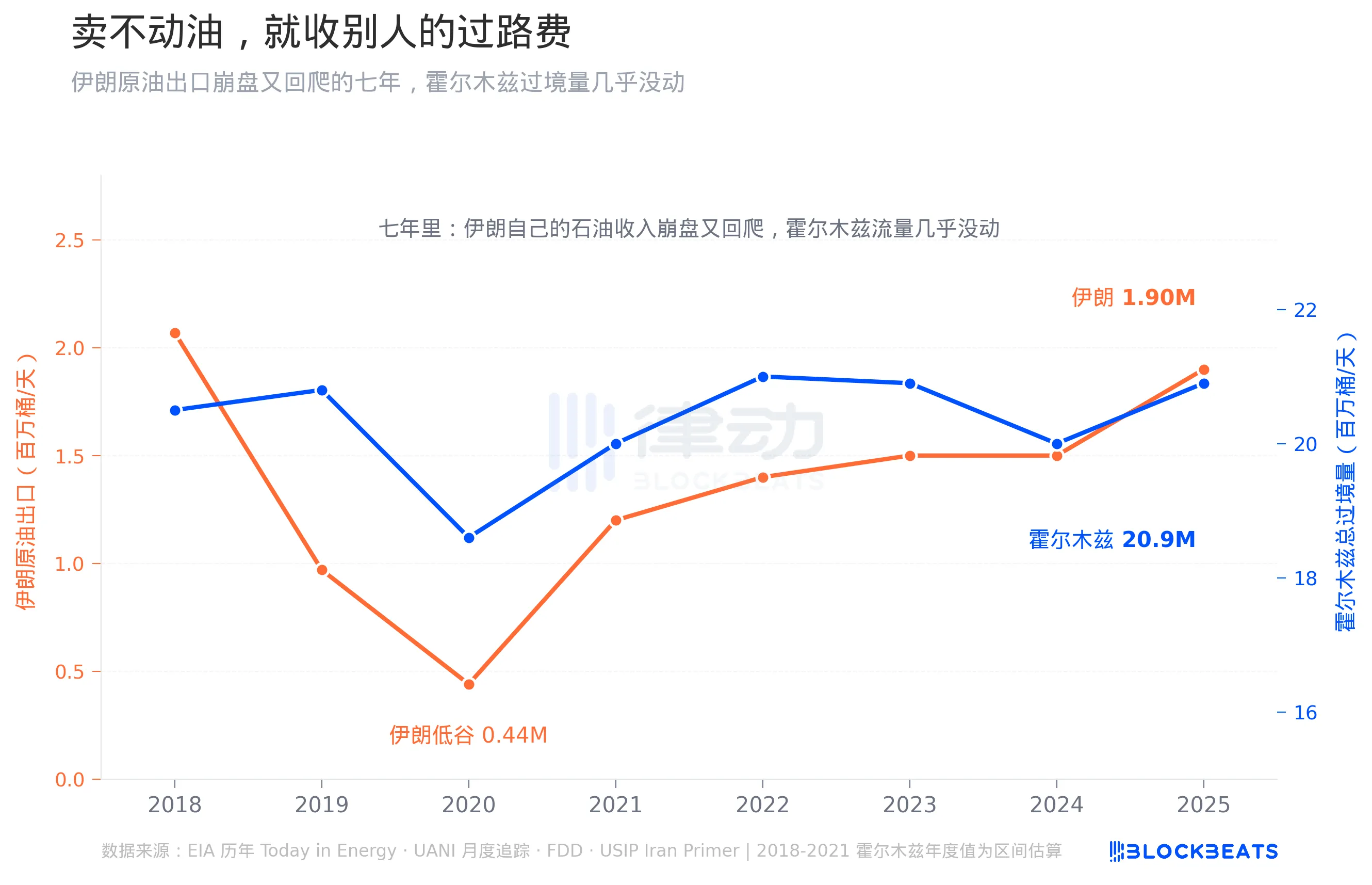 The right axis is the total transshipment volume of the same waterway. According to EIA's annual reports, it was 20.5 million barrels per day in 2018, 21 million barrels in 2022, 20 million barrels in 2024, and 20.9 million barrels in the first half of 2025. Over seven years, Iran's own oil has been decreasing from its doorstep, but not a single barrel less has been taken from the neighbor's house. To Iran, this waterway has always been "others' business, my gateway."