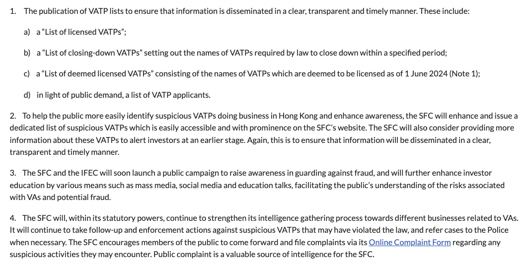 The SFC said it will also keep a dedicated list of "suspicious VATPs" which will be featured in an easily accessible and prominent part of the regulators' website.