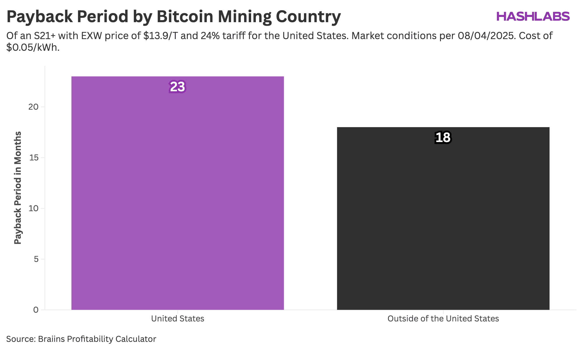 The chart below shows the projected payback period for an Antminer S21+ when deployed in the United States versus a country unaffected by tariffs. As the data illustrates, paying 24% more for the same machine in the U.S. dramatically extends the payback period—undermining the core economic case for mining domestically.