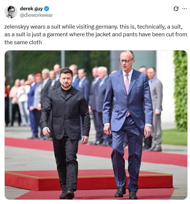 Meanwhile, Canadian men’s fashion industry writer and commentator Derek Guy, also known as the menswear guy on X, didn’t do much to solve the dispute, saying on June 26 he thinks Zelenskyy’s outfit is “both a suit and not a suit.”