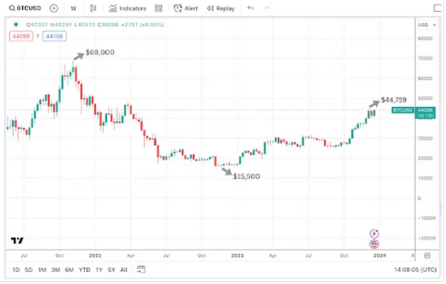 With spot Bitcoin ETFs set to be approved, and a halving on the way in April, everyone expects bitcoin to rise in 2024. But history suggests that might not be the case, says Frank Corva, at Finder.com.