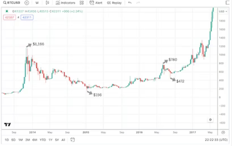 If bitcoin’s price were to fall 40% from these current levels — as it did in 2015-2016 — we’d see bitcoin’s price at $26,855. (As of writing, it is approaching $44,000).