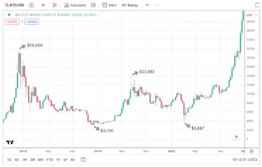 From late 2017 to late 2018, bitcoin’s price fell from $19,666 to $3,150 before rebounding to $13,882 — 70% of the previous all-time high. By March 2020, its price had fallen 72% to $3,867.