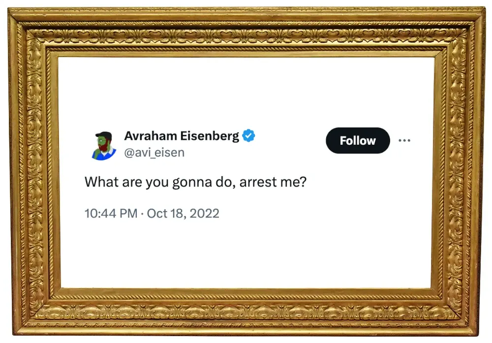Avi Eisenberg, the perpetrator of the October 2022 Mango Markets theft [I6, I43, I55], was found guilty of fraud and market manipulation. He faces up to twenty years in prison. His sentencing has not yet been scheduled [W3IGG]. It turns out that although he "believe[d] all of our actions were legal open market actions", a jury didn't.