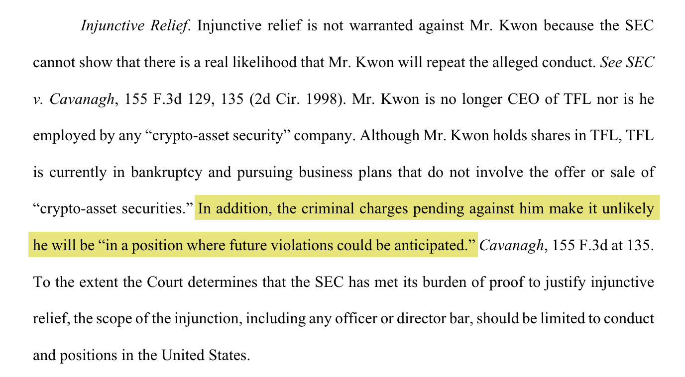 The SEC has asked the judge to order Terraform Labs and its former CEO Do Kwon to pay a combined $4.74 billion in disgorgement and interest. They also want fines of $420 million from Terraform Labs, and $100 million from Kwon, as well as a ban on Kwon from serving as an officer or director of a publicly traded company.12 Kwon has, naturally, opposed this motion — arguing that no injunction or disgorgement is needed, and that a fine of $250,000 to $300,000 seems more reasonable. Part of his argument seems to me to boil down to "well he's going to be in prison soon, so you don't really need to worry about him becoming an officer or director."13