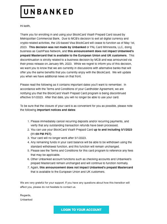 Please be aware, if you're enrolled in a US Litecoin Visa card you will no longer be able to use it as of May 1st, 2023. Our partner @UnbankedHQ is transitioning away from banking partner @MCBankNY, who have decided to stop supporting businesses that touch digital currencies. pic.twitter.com/LlL8xSYsqI