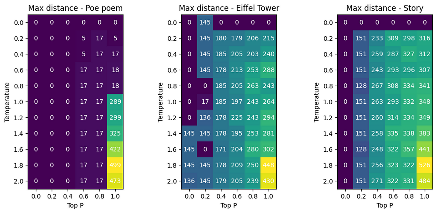 As you can see, the results are also different for each prompts… except for the highest values: for all the prompts, temperature=2 and top_p=1 outputs complete giberrish. For reasonable values (for example temperature = 1 and top_p = 0.5) the outputs for the model have a higher distance for more creative prompts.