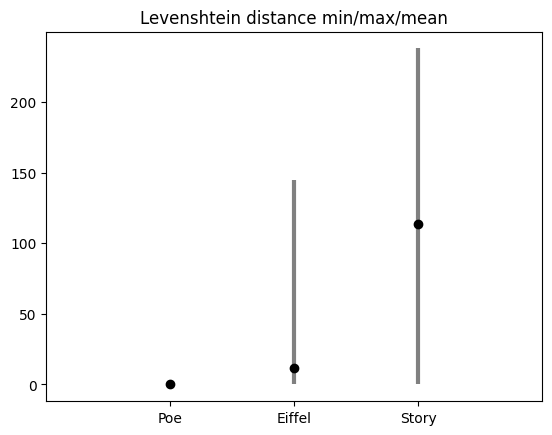 In the following figure, I compared the 50 outputs to each other with the Levenshtein distance, and calculated the min,max and mean distance: