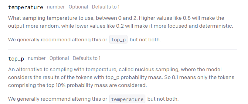 According to the documentation, chat-based models have 2 parameters; temperature and top-p. To explore the subject I did a small experiment.