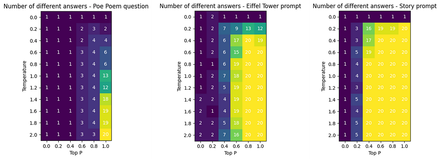 I ran a query with each of those prompts 20 times while changing the temperatures and top_p parameter incrementally, and I counted the number of different occurrences for each.
