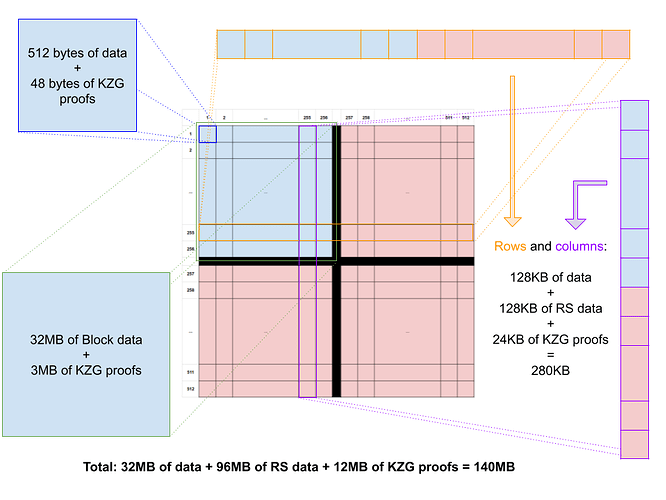 Figure 1 shows the 2D data availability encoding as proposed in Danksharding, using a square structure, using the same RS code with K=256 and N=512 in both dimensions. This means that any row or column can be fully recovered if at least K=256 segments of it are available.