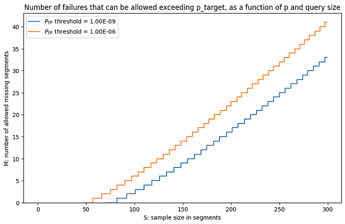 In LossyDAS, just as in the original test, we set the target FP probability (i.e., cases when the test passes, we think the data has been released, but it is actually in a non-repairable state). We look for the minimal value of S (the sample size) as a function of
