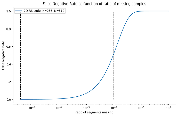 As we can see in Fig.4, we can sample slightly more and allow for losses while keeping the same FP threshold. For example, with a target FP of 1e-9, we can choose a sample size of 84 and allow 1 missing segment. Or we can go for 103 segments and allow up to 3 losses. In general, instead of sampling with n=73, approximately every 10 more segments allows us to tolerate one more missing segment.In practice, this means that nodes can try to download slightly more segments, already factoring in potential networking issues or other transient errors.