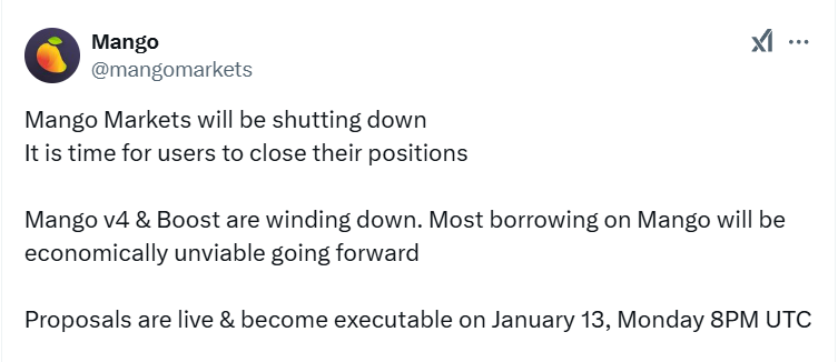 On Jan. 11, Mango Markets announced through its X account that it is “shutting down” and it is time for users to “close their positions.”