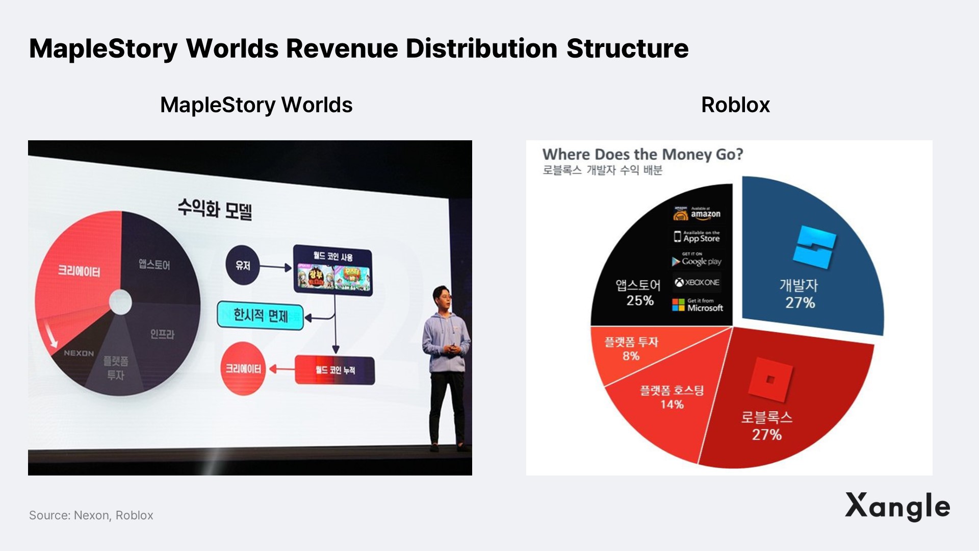 The standout feature of <MapleStory Worlds> lies in its creation of a platform that enables individuals to craft, share, and immerse themselves in unique worlds (content) using MapleStory and other IPs. Creators of these worlds have the opportunity to earn a portion of the revenue generated from user purchases. Although exact figures are not specified, the revenue-sharing model is anticipated to resemble that of Roblox developers (refer to the diagram below).