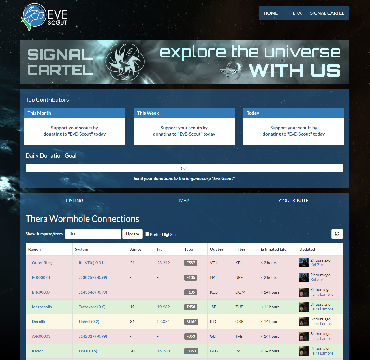 MapleStory Universe leverages public blockchain technology for the issuance and management of goods, providing transparent accessibility to token (FT, NFT) and item reward data. As a result, users have the potential to observe various on-chain data in real-time, including in-game transaction details, item distribution statistics, creator-specific revenue distribution, and more. Throughout this process, Nexon not only fosters trust among users but also foresees the proliferation of numerous third-party forums, data analysis tools, and information sites centered around on-chain game data. This phenomenon parallels third-party tools for games like EVE Online (for example, the EVE-SCOUT forum depicted in the captured image below is an externally created real-time wormhole status analysis site, operating solely on donations).