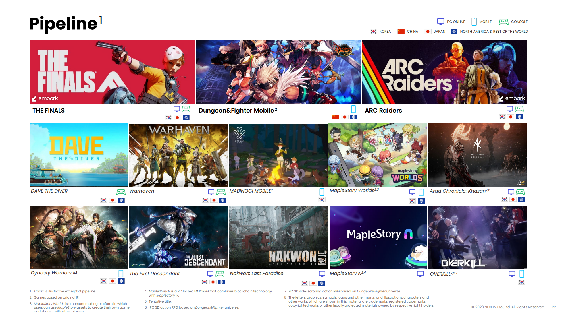 Nexon owns several key long-standing IPs that serve as cash cows. MapleStory, 20 years after its launch, remains a core title for Nexon, recording its highest-ever revenues. Dungeon Fighter, Sudden Attack, FC Online, and KartRider are also enduring services, still enjoying strong support from dedicated fan bases. The diversity of genres across these IPs is also notable. Nexon plans to continue this trend of stable operation of these core live services for sustained growth.
