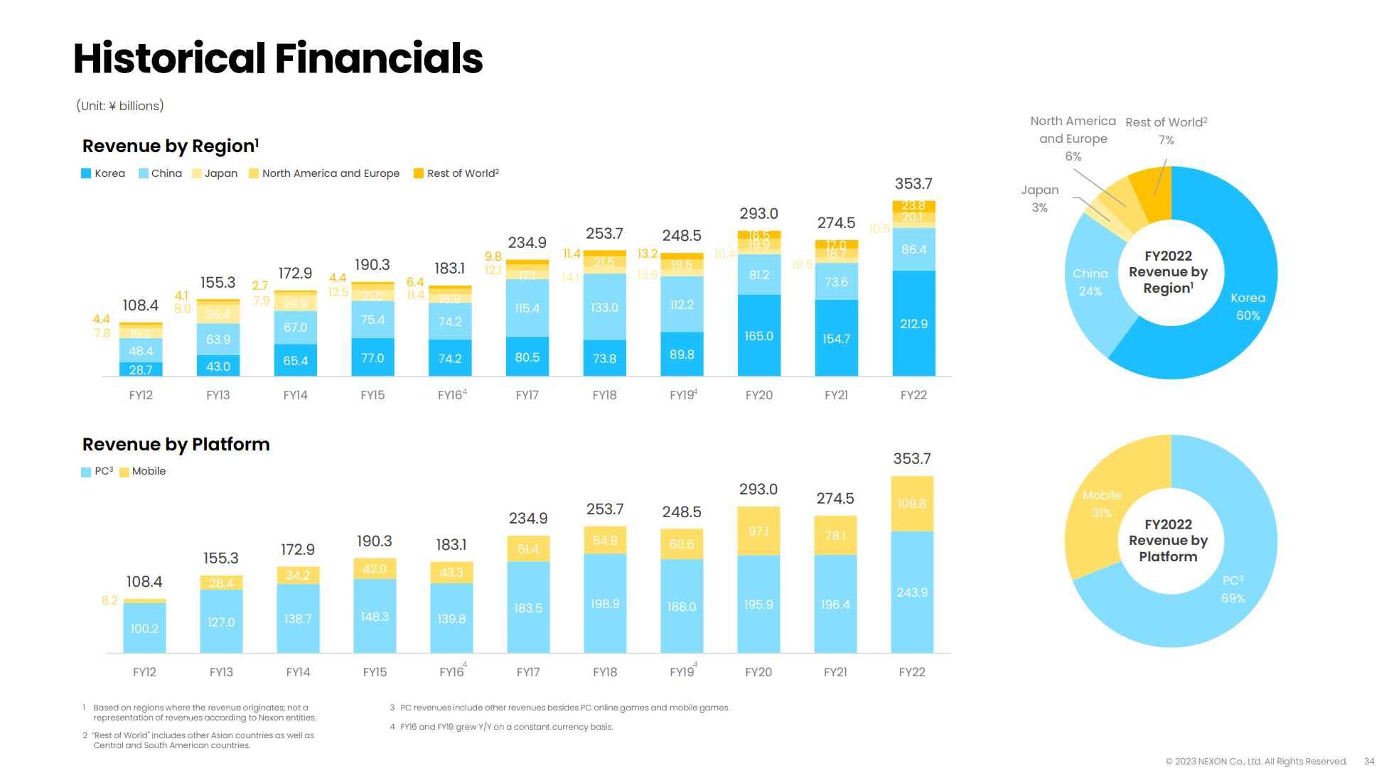 Since its inception in 1994, Nexon has overcome numerous challenges and continues to grow impressively. Over the past decade, Nexon has recorded a Compound Annual Growth Rate (CAGR) of 12.5%, growing its revenue from KRW 940B in 2012 to KRW 3.5T in 2022. For context, in 2022, Netmarble, NCSoft, and Krafton each achieved revenues of KRW 2.7T, 2.5T, and 1.8T respectively (77%, 71%, and 51% of Nexon’s revenue).