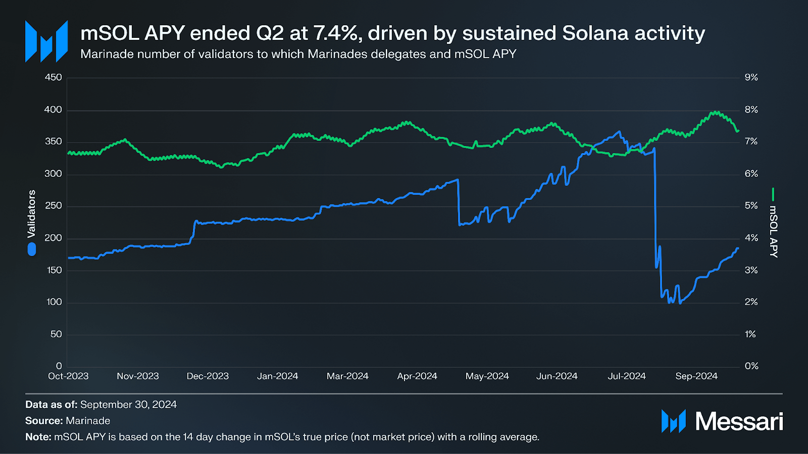 Marinade's Q3 2024 performance highlights its resilience and innovation. Total Value Locked (TVL) increased 9% QoQ to $849.3 million, while mSOL APY grew 5% to 7.6%. Marinade maintained a 33% combined market share despite a 6% decline in liquid staking. Key upgrades like Protected Staking Rewards (PSR) and the Stake Auction Marketplace (SAM), which went live in August, focused on staker protection and validator accountability.