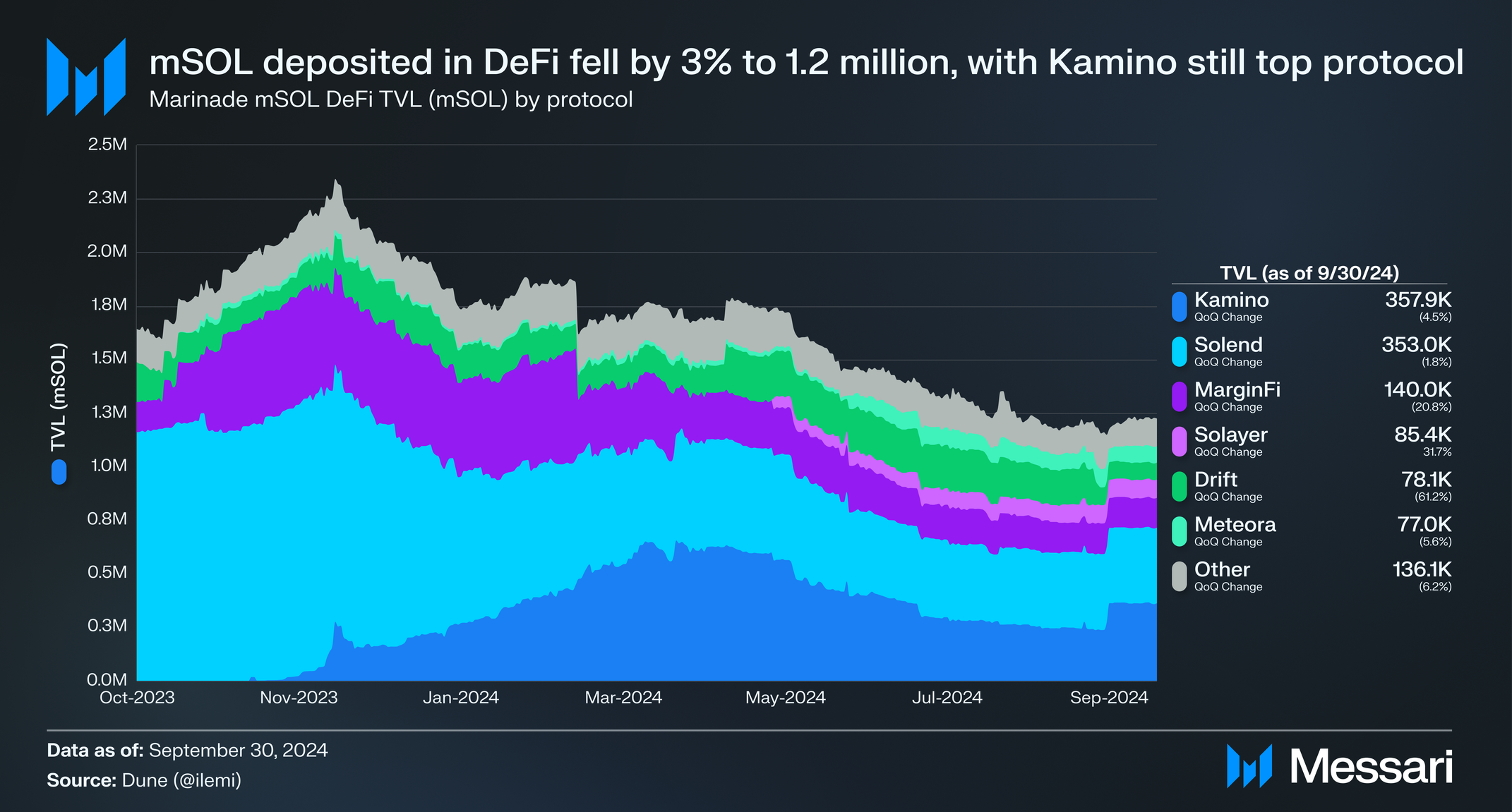 - mSOL deposits in DeFi fell 3% QoQ to 1.2 million. Kamino led TVL for the second quarter in a row with 357,900 mSOL.