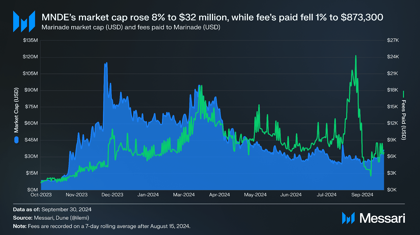 - Marinade removed the 6% stake fee from its liquid staking product, meaning its remaining revenue was generated from unstaking and the Stake Auction Marketplace.