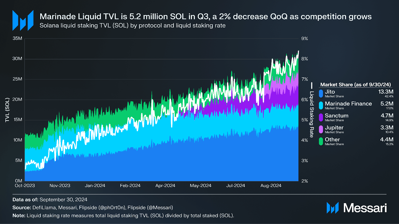 The top competitors for Marinade Liquid Staking include Jito, Sanctum, and Jupiter. Marinade’s market share fell by 6% QoQ to 17%, with Jito’s flat at 42%. Including Marinade Native, which accrued 2.5 million staked sol, Marinade’s market share in Q3 was 33%.