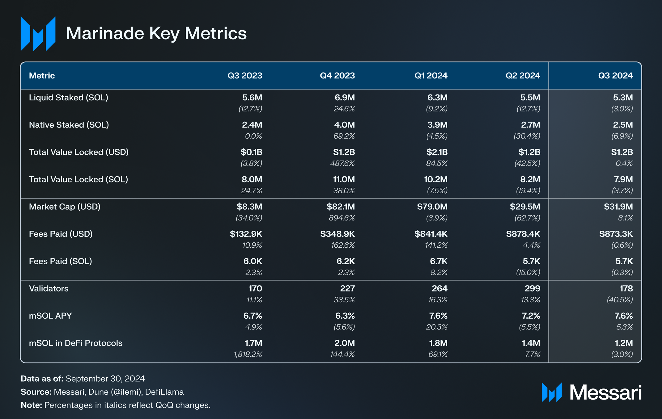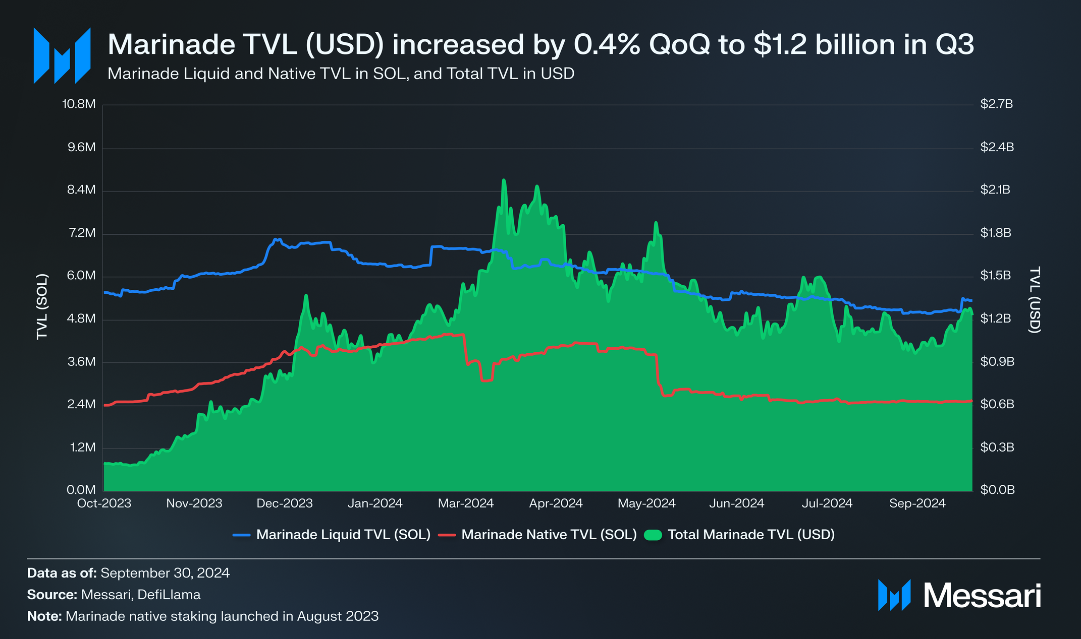 - Marinade's Total Value Locked (TVL) increased by 9% QoQ to $849.3 million. Native staking now comprises 31% of Marinade's TVL.