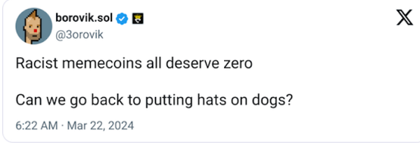 Things have hit an all-new bottom with 2024: racist, sexist, and other shitheaded memecoins.”