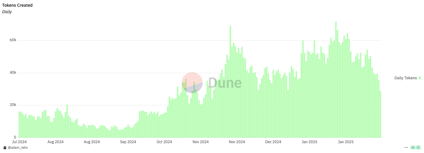 On Jan. 23, a record of 71,735 tokens were launched on the Pump.fun, but by Feb. 19, that number had dwindled to just 28,898.