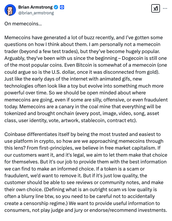Coinbase CEO Brian Armstrong has also come out in support of memecoins, saying that market participants should remain “open-minded” about the future of memecoins.