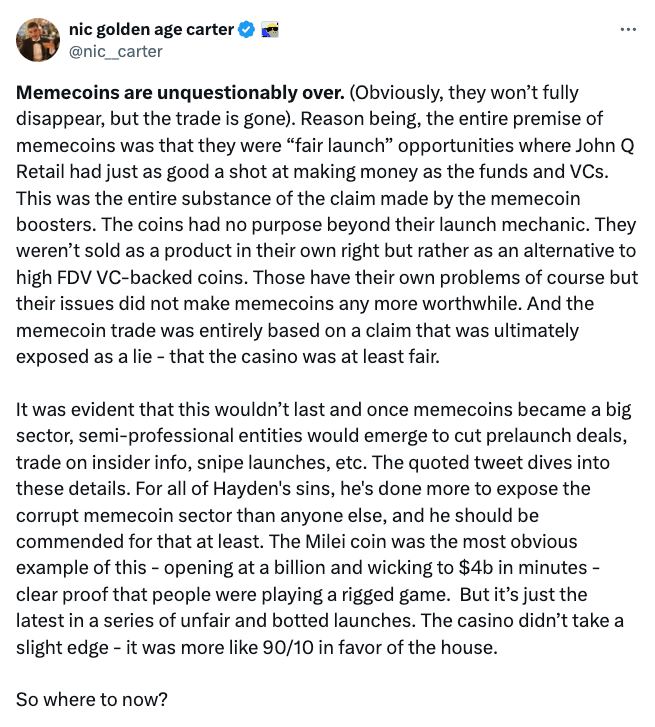 Nic Carter, a partner at Castle Island Ventures, says the time for memecoins is “unquestionably over” following the recent $4 billion LIBRA scandal involving Argentine President Javier Milei.