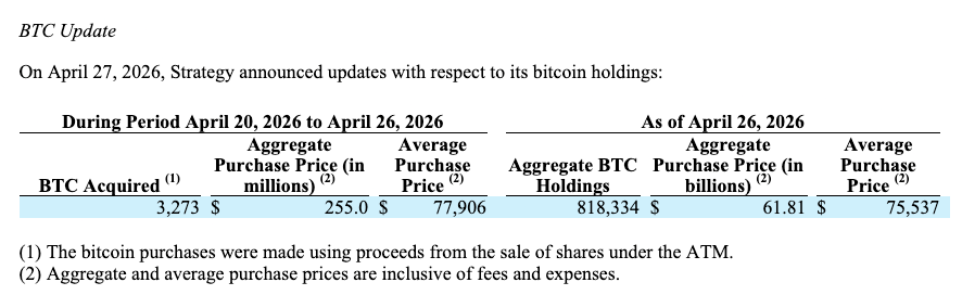 Strategy acquired 3,273 Bitcoin for $255 million between April 20 and 26, according to an 8-K filing with the US Securities and Exchange Commission on Monday.