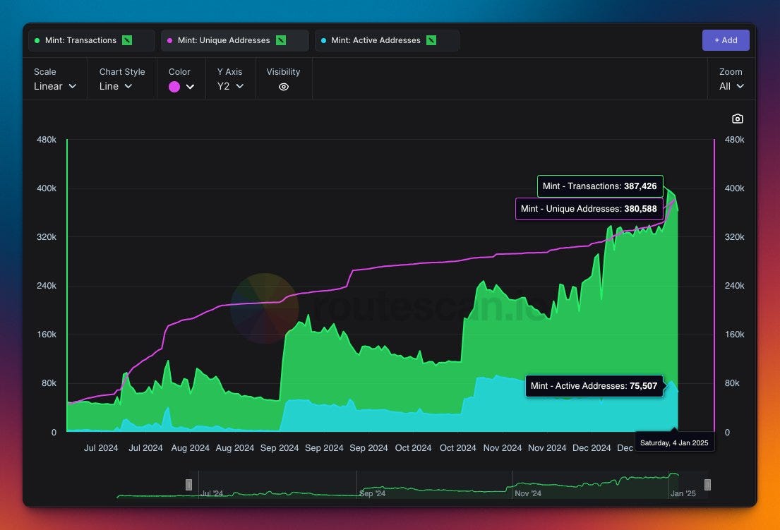 - 80,000 daily active addresses: Increasing frequency of user engagement with Mint Blockchain