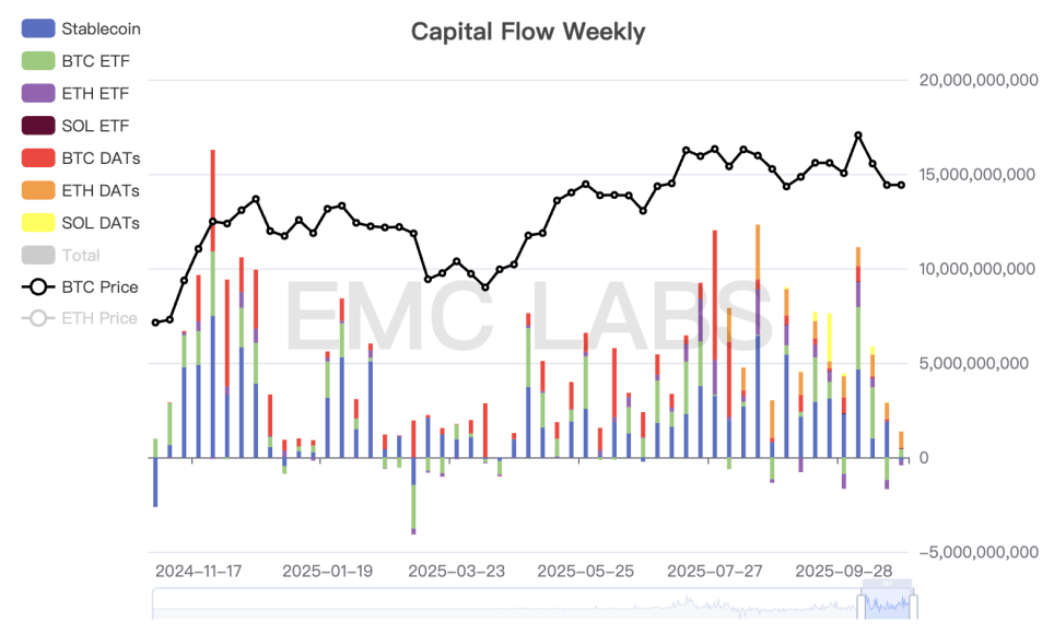 In the new market structure, the main forces absorbing selling pressure, DATs companies and BTC Spot ETF channel funds, also showed weakness this week. According to eMerge Engine statistics, total funds flowing into the crypto market this week amounted to only $943 million, the lowest in several months.