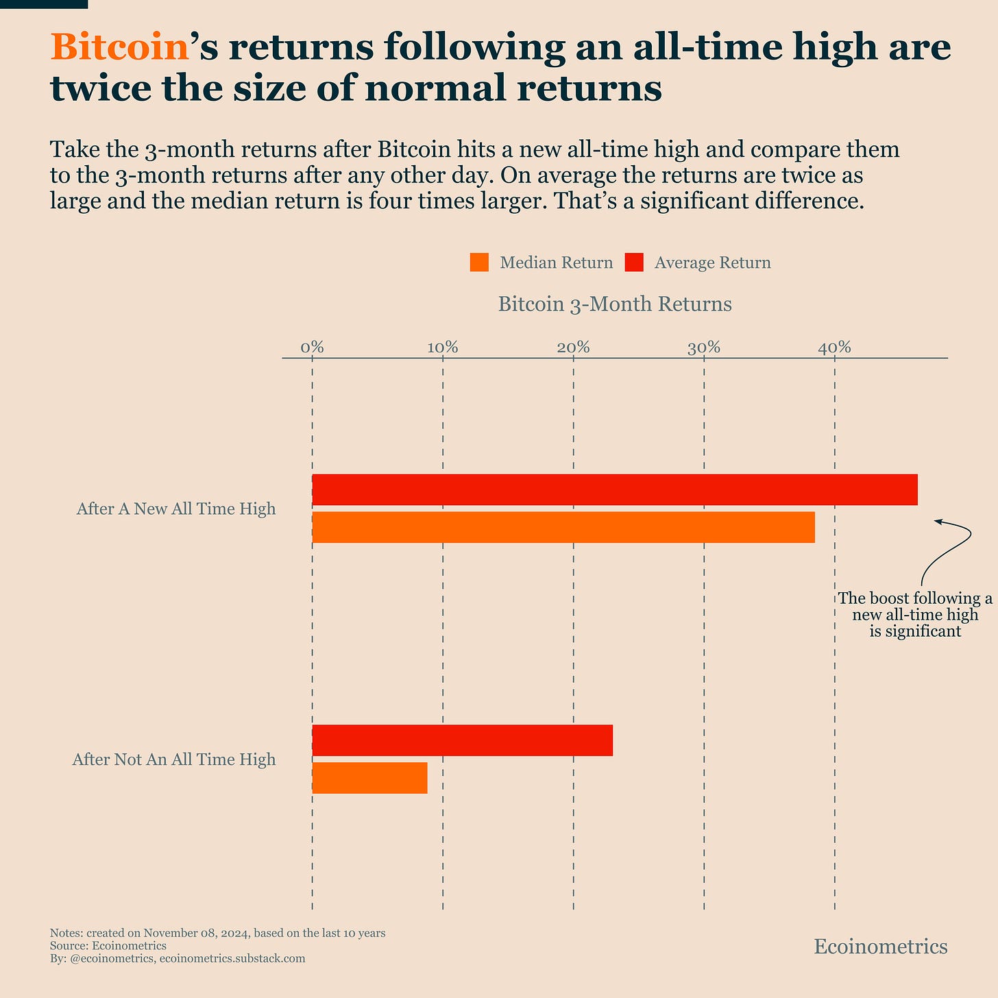 Actually you can do the math looking at historical data. The Bitcoin returns over a 3 months period that follow a new all-time high are 46% on average with a median of 39%.