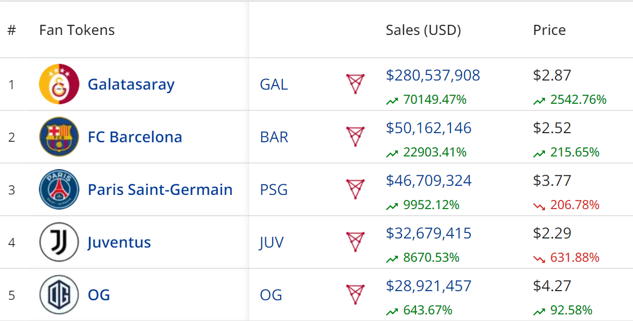 Sales of fan tokens increased last week due to important soccer competitions in Europe and the Americas. With Turkey’s first Euro 2024 victory, the Galatasaray (GAL) fan token saw the biggest increase in sales volume, rising an astounding 70,149% to $280.5 million. Also, the token’s price jumped by 2,542%, to $2.87 per unit. Sales of fan tokens for FC Barcelona, PSG, and Juventus also experienced a notable surge, with rises ranging from 22,903% to 8,670%, as Spain, France, and Italy successfully began their Euro 2024 campaigns.