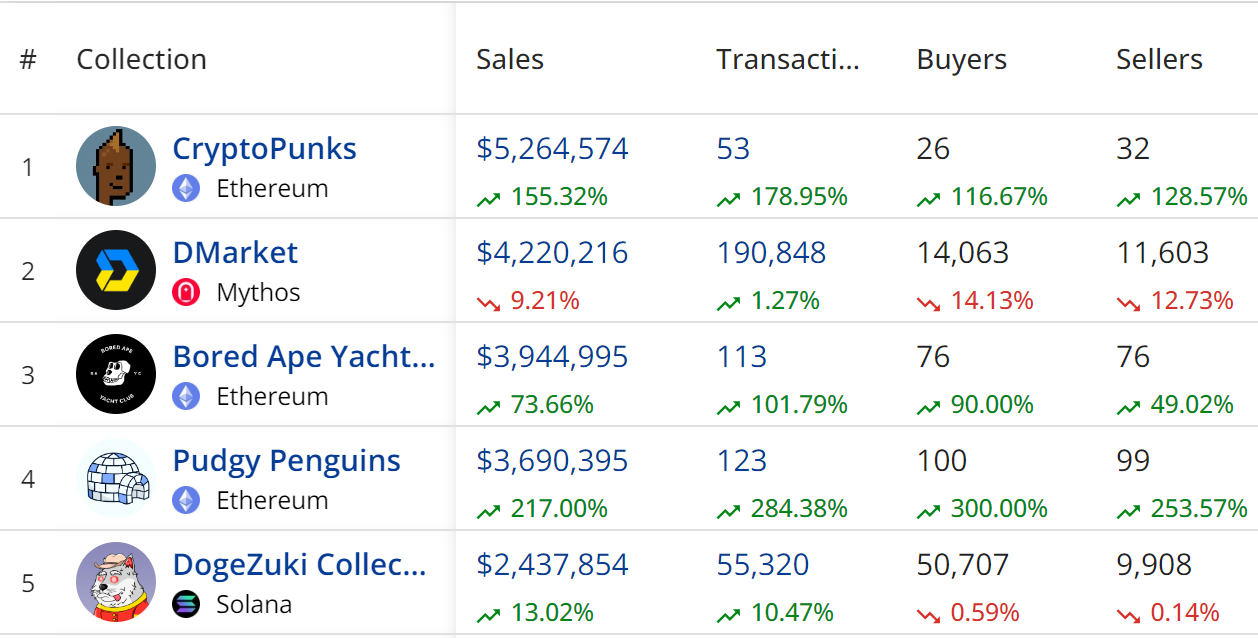 Among NFT collections, CryptoPunks made a strong comeback. It registered a 155% jump in sales volume, earning $5.26 million and becoming the top-selling NFT collection of the week. DMarket from Mythos saw a 9.21% dip in sales but still managed to earn over $4 million. With almost $3.5 million in sales, Bored Ape Yacht Club (BAYC), an Ethereum-based company, came in third place, up 73.66% from the previous week.