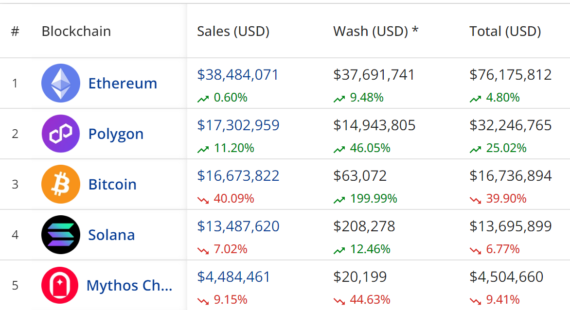 Ethereum is still the leading blockchain for NFT sales. It recorded $38.4 million in transactions last week. However, Ethereum also saw a significant rise in wash trading, with earnings from this activity increasing by nearly 9.5% to $37.69 million.
