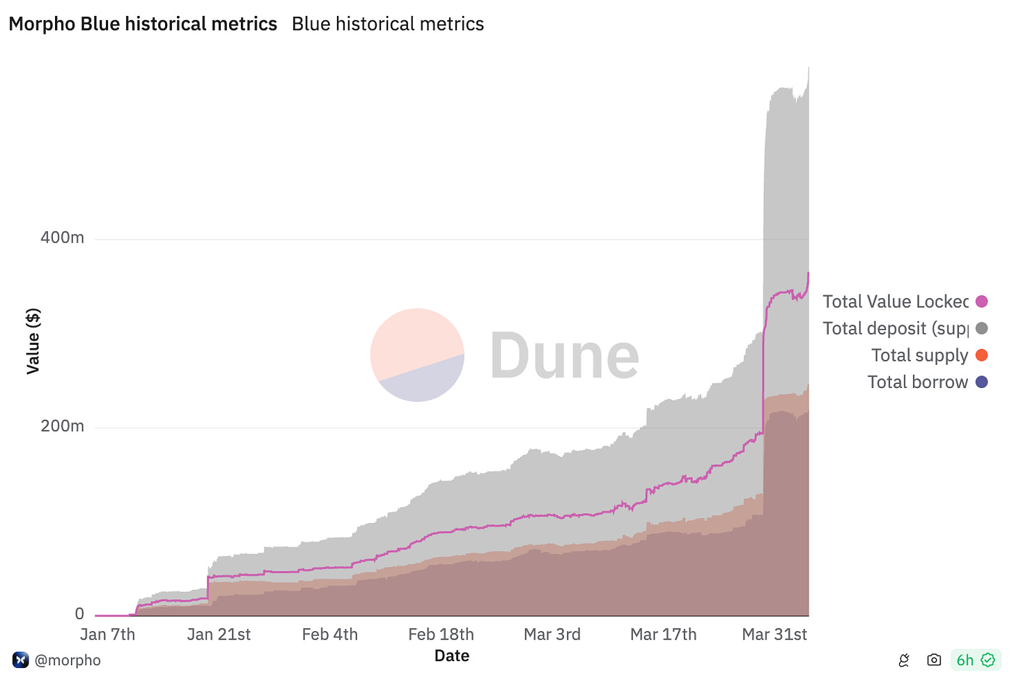 - In January, Morpho launched a new lending protocol named Blue. It is a simple lending primitive layer that allows the creation of immutable and efficient lending markets in a permissionless way. Within just 24 hours of its launch, Morpho Blue nearly doubled its total deposits, reaching close to $600M, fueled by strategic partnerships with MakerDAO and Ethena. Through its D3M, Spark deployed 100M DAI to USDe/DAI markets quickly attracting many borrowers.