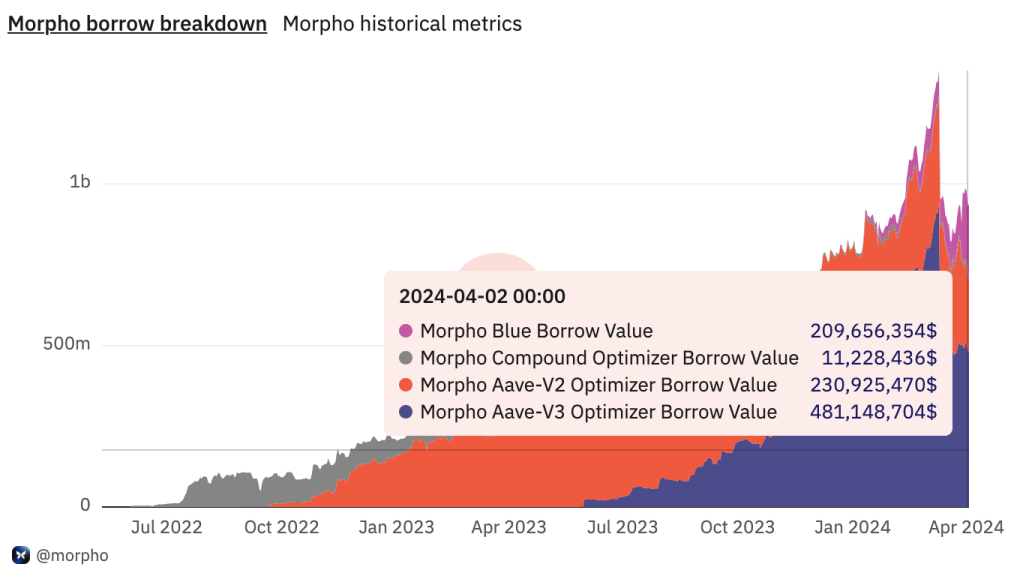 - Morpho is approaching 1B$ in total borrow value with around 220M$ coming from its new lending product, 450M$ coming from its Aave-V3 Optimizer and 300M$ from the Aave-V2 Optimizer. Notably, Morpho surpassed Compound's total borrow in February.