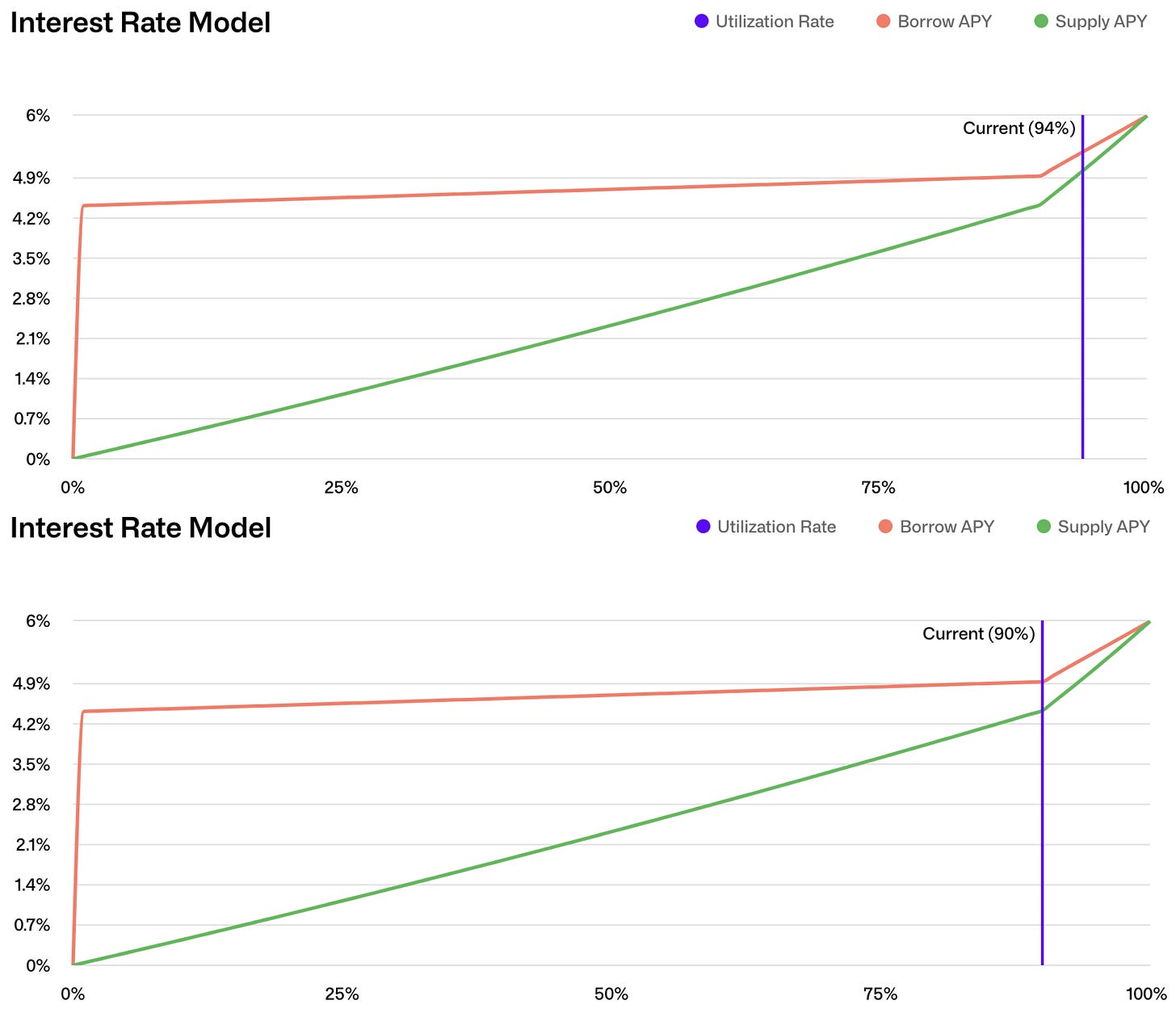 - The target utilization rate of stablecoin pools at Flux is around 90%, with a sharp kink to incentivize borrowers to repay their loans should the utilization rate increase too far beyond this.