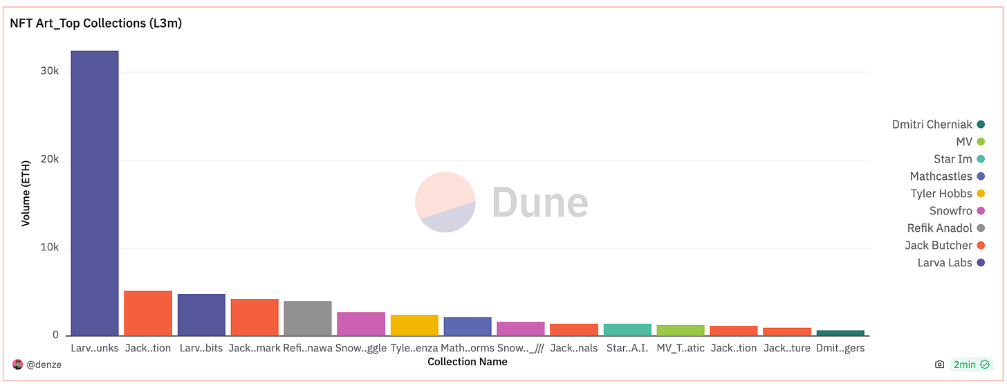 - With an endless increase in new artists and collections, across many genres and styles, the NFT art market has grown significantly in recent years. This is evident if we look at the most popular artists of the last 3 months, measured by secondary volume. It includes established artists such as Larva Labs (37k ETH) and Snowfro (4k Ξ), as well as newer artists like Jack Butcher (13k ETH). The list also reveals the growing demand for AI art from artists like Refik Anadol (4k Ξ) and Star Im (1.4k Ξ).